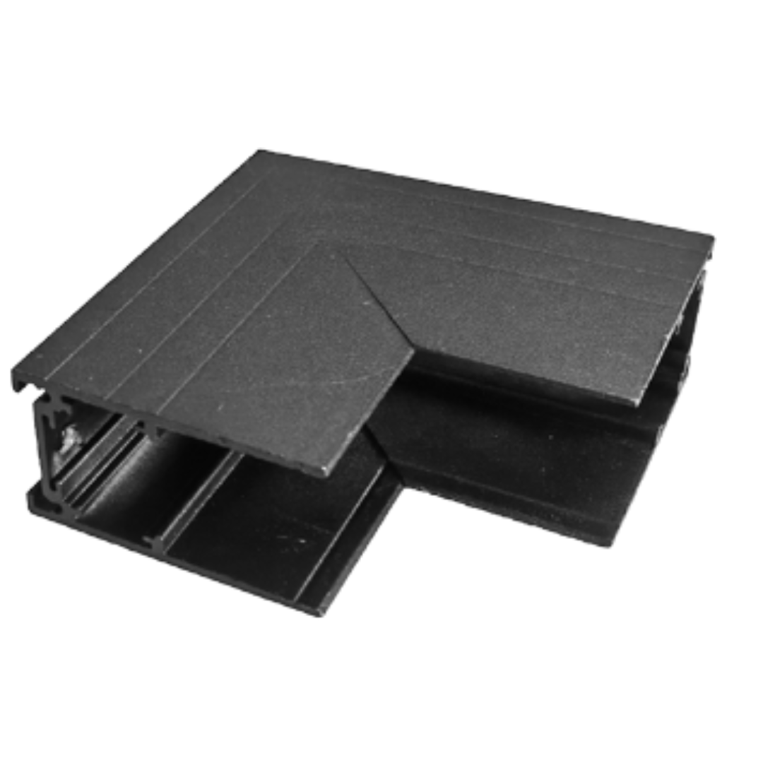 Este producto es un conector en ángulo para rieles de iluminación magnéticos, diseñado para unir tramos de riel en esquinas de techo o pared.